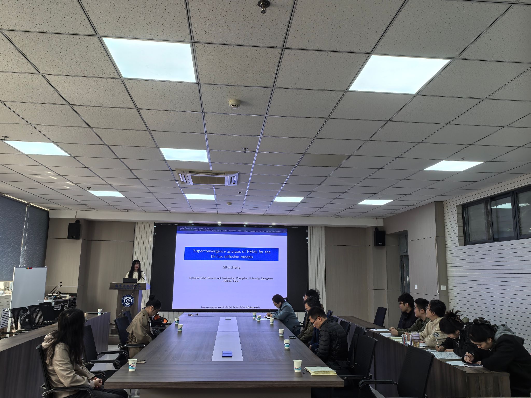 在报告会上,张思惠博士介绍了其在高阶奇异扰动方程和有限元方法研究方面的成果。针对四阶奇异扰动双通量方程,基于Bramble-Hilbert(B-H)引理,首次论证了线性三角形有限元的高精度特性这一此前未被揭示的关键性质。此外,报告还提出了各向异性网格下约束非协调旋转双线性元的若干新型超收敛误差估计。通过构造能量耗散格式,获得了无条件一致的超收敛性,并辅以数值实验佐证理论。报告会中,与会师生积极发言踊跃提问,与张思惠博士开展了广泛且深入的交流与探讨,现场学术氛围浓厚。
