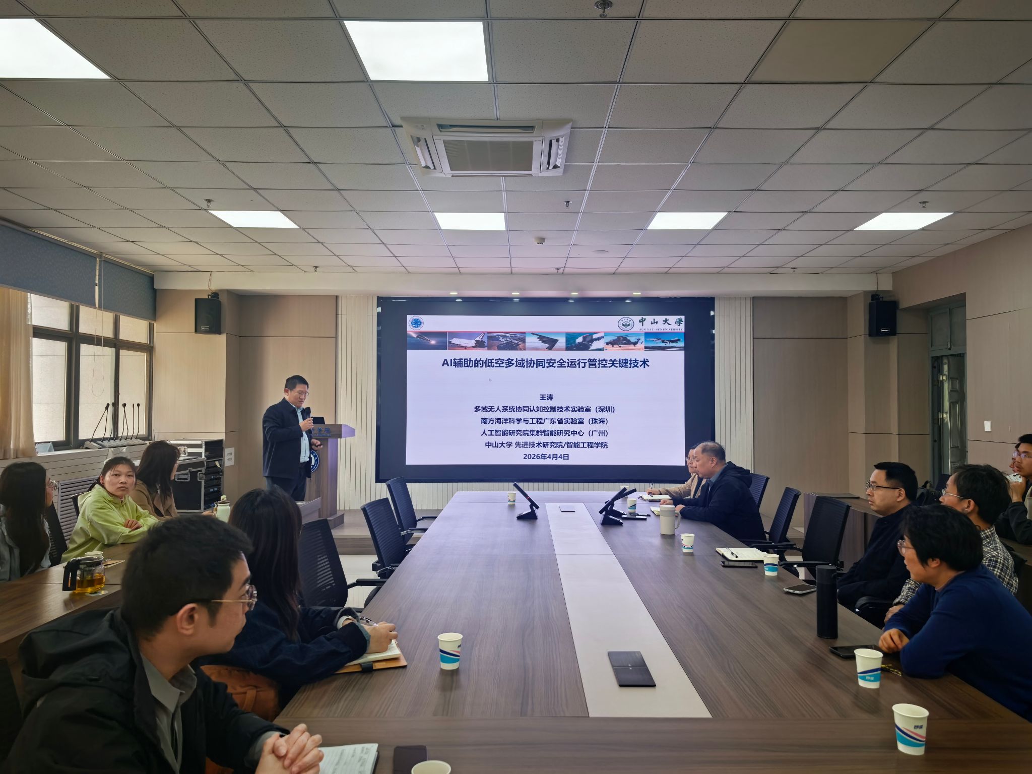 王涛教授以人工智能辅助低空多域协同安全运行管控所面临的现实挑战为切入点,系统概括了大模型与认知架构融合的辅助管控技术研究思路。他重点介绍了基于SOAR类人认知架构构建的低空多域协同安全管控通用框架,并围绕大模型在管控任务理解、管控意图识别、飞行安全控制及任务筹划等四个关键技术方向进行了深入讲解。报告会现场互动交流气氛热烈。与会师生围绕技术落地场景、框架优化方向及行业应用前景等问题踊跃提问,王涛教授结合自身研究经验进行了细致解答。